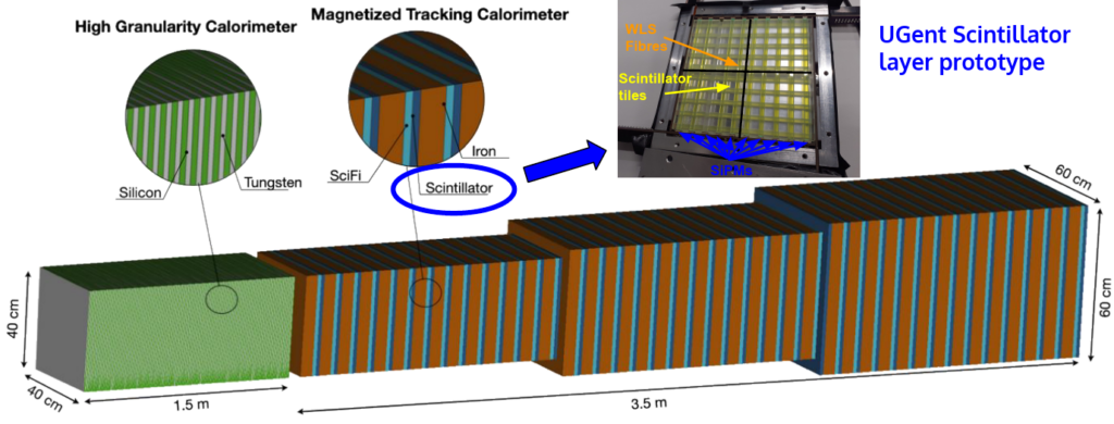 The final section of the experiment is composed of a spectrometer tracker, a timing detector and a calorimeter system. The first is composed of a straw tube detector and a large magnet, enabling the reconstruction of charged decay vertices. The timing detector is meant to ensure that no background is induced by combinatorial particles entering the detector at the same time from separate events. Finally, the calorimeter system enables energy reconstruction, particle identification and vertexing for neutral decays. The Ghent University group is contributing to the latter with emphasis on detector optimisation and the elaboration of High-Precision-Layers based on a novel detector concept conceived in Ghent: the Scintillating-fibre High Accuracy Reconstruction Planes (SHARP) which allow for excellent shower directionality reconstruction to take place.